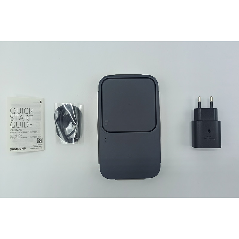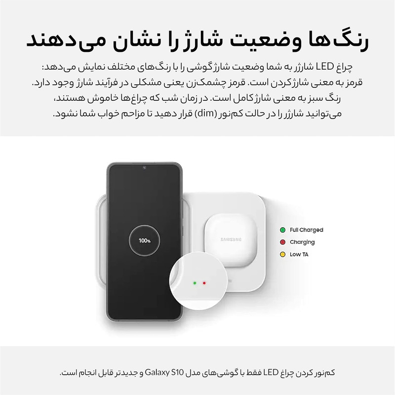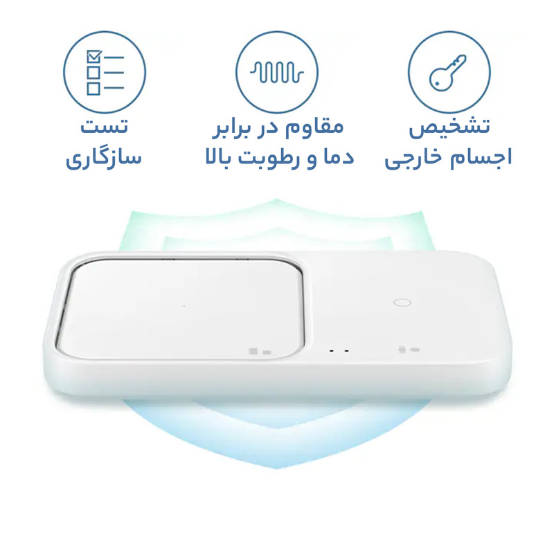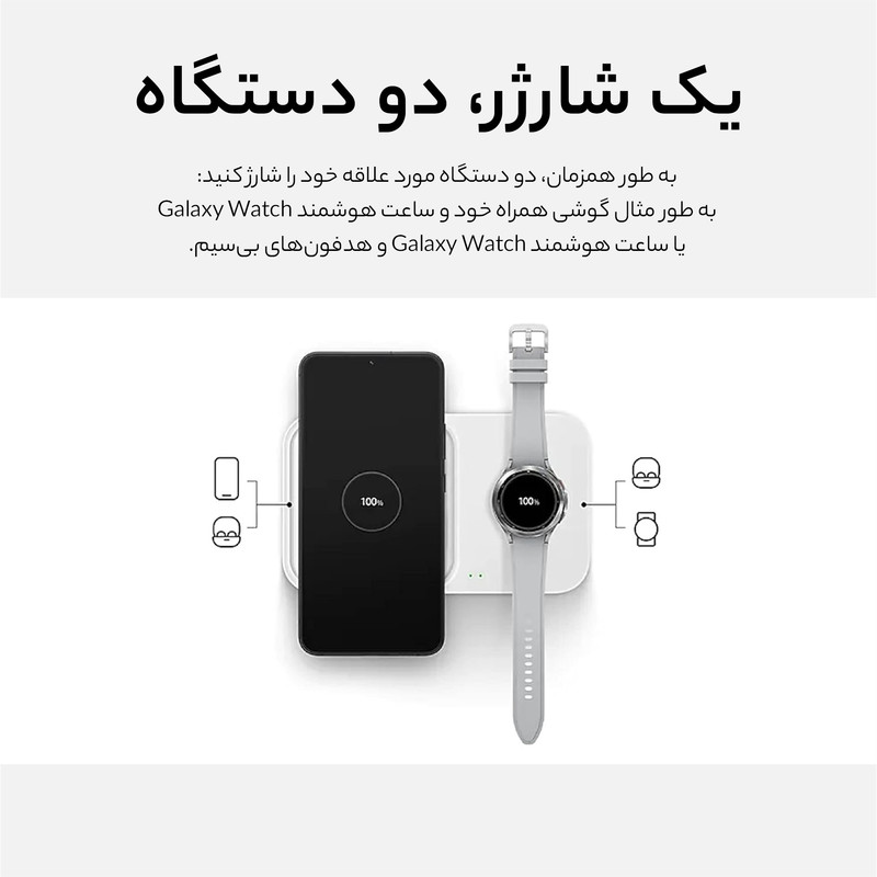 وزن شارژر بی سیم سامسونگ 170 گرم وزن بوده و ابعاد 15.6x9.1x1.64 سانتی متر می باشد و برای شارژ سریع موبایل مناسب است، این کالا دارای توان خروجی 10 تا حداکثر 15 وات بوده البته سرعت شارژ برای دستگاه های مختلف امکان دارد متفاوت باشد. در جعبه این محصول یک کابل Type-C به Type-C و یک آداپتور شارژ سریع 25 وات PD وجود دارد که برای شارژ کردن آن مناسب است. این محصول قابلیت شارژ همزمان موبایل و galaxy watch یا شارژ همزمان earbuds و galaxy watch را دارد، و لازم به ذکر است که قسمت سمت راست این کالا فقط برای شارژ سری galaxy watch و earbuds می باشد. این دستگاه همچنین برای شارژ ساعت های galaxy watch4 ,watch3,active2 , active مناسب است. از سایر ویژگی های این کالا می توان به سیستم خنک کننده و همچنین قابلیت شارژ ایمن برای جلوگیری از دمای بالا، رطوبت و گرم شدن بیش از حد در زمان شارژ اشاره کرد و همین طور قابلیت تشخیص دخالت سایر اشیا هنگام شارژ را دارا می باشد. این کالا چراغ LED دارد که وضعیت شارژ را نشان می دهد که چراغ قرمز برای شارژ است که وقتی که به صورت چشمک زن باشد مشکلی در شارژ را نمایان می کند و چراغ سبز رنگ شارژ کامل را نشان می دهد، البته توانایی خاموش کردن این چراغ ها از سری galaxy S10 به بعد وجود دارد. شدت جریان و ولتاژ ورودی آن نیز 9V/2.77A می باشد.