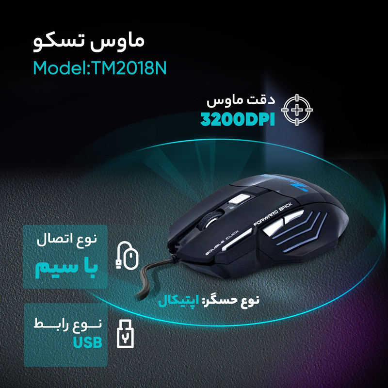 محصولی که در این قسمت مشاهده میکنید یکی از ماوسهای پیشرفتهی شرکت تسکو است. این ماوس که 7 دکمه مجهز شده است برای اجرای بازیهای کامپیوتری و کنترل مولتیمدیا بسیار مناسب است. با توجه به قابلیت تنظیم دقت ماوس تا 3200 dpi میتوان گفت که از این محصول برای اجرای بازیهای کامپیوتری ایدهآل است. نوع حسگر این محصول بهصورت نوری و یا اپتیکال است که دقت بسیار بالایی را به ارمغان میآورد. طول کابل این محصول بهصورت استاندارد بوده و به 1.5 متر میرسد همچنین پوشش کابل از نوع کتان است که مقاوم آن را در طول زمان و طی استفادهی طولانیمدت بالا میبرد. برای کلیدهای ماوس میزان 5 میلیون کلیک توسط شرکت سازنده عنوان شده که نشان از مقاومت بالای محصول دارد. برای اتصال دستگاه به رایانه بایستی از درگاه استاندارد USB استفاده کنید که در تمامی کامپیوترهای امروزی یافت میشود. شرکت سازنده این محصول را از مدلهای مخصوص بازی خود معرفی کرده است.