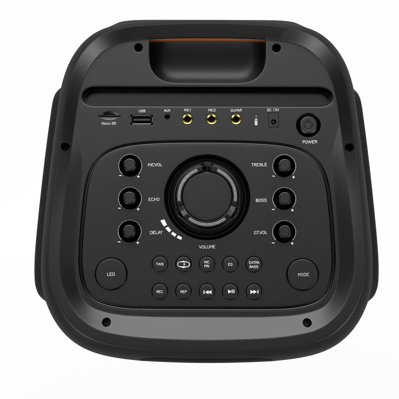 با نسخه بلوتوث پیشرفته 5.0 این اسپیکر، ارتباط بیسیم با دستگاههای مختلف را به سادگی و باکیفیت بالا فراهم میکند. ورودی میکروفن دوگانه آن، امکان استفاده از دو میکروفون به طور همزمان را فراهم میکند.