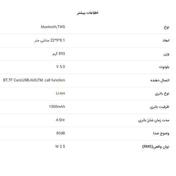 اسپیکر TS 23151 تسکو دارای طراحی دوست داشتنی است ، افرادی که در محیط خارج از خانه به دنبال یک اسپیکر همه فن حریف می گردند ، را به خود معطوف کرده است . اتصال بی سیم این اسپیکر از طریق بلوتوث نسخه 5.0 است روی بدنهی TS 2311 کلید هایی برای کنترل صدای موسیقی در حال پخش تعبیه شده است. همچنین پورت های U Disk-TF Card-FM-AUX با زیبایی و یکدستی بدنه محصول حفظ میشود. اسپیکر TS 23151 انرژی مورد نیاز خود را از طریق یک باتری Li-ion قابل شارژ با ظرفیت 1500 میلی آمپر تامین میکند . اگر شما هم از آن دسته افرادی هستید که هنگام انجام دادن هرکاری از گوش دادن به موسیقی انرژی میگیرید و لذت میبرید،اسپیکر های پرتابل برای شما بهترین انتخاب هستند چون حمل و استفاده ی راحتی دارند.به وسیله ی این دستگاه کاربردی شما به هرجا که اراده کنید میتوانید آن را حمل کنید و از گوش دادن به موسیقی با کیفیت بالا بهره مند شوید.
