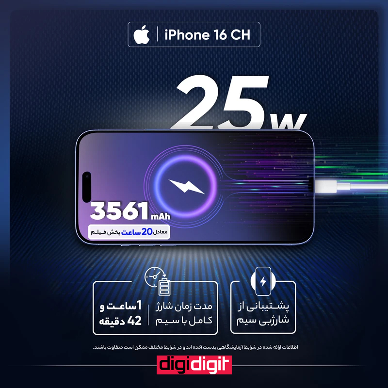 مشخصات باتری : شارژ با سیم به کمک تکنولوژی PD۲.۰ و ۵۰ درصد شارژ در ۳۰ دقیقه/ شارژ بیسیم با توان ۲۵ وات (از راه MagSafe)/ شارژ بیسیم با توان ۱۵ وات (از راه شارژرهای بیسیم سازگار با تکنولوژی Qi۲) / شارژ معکوس با توان ۴.۵ وات به صورت با سیم/