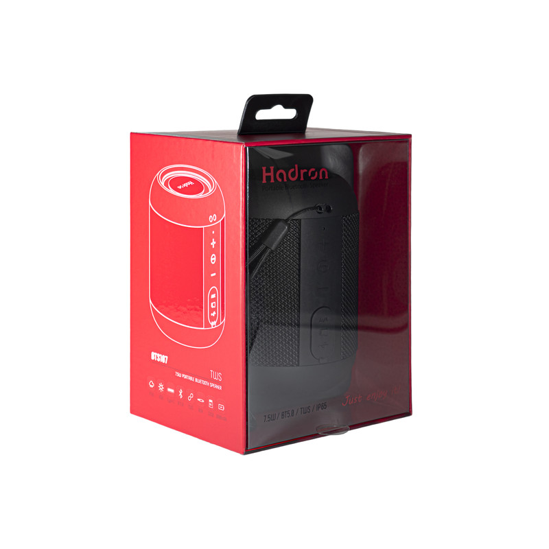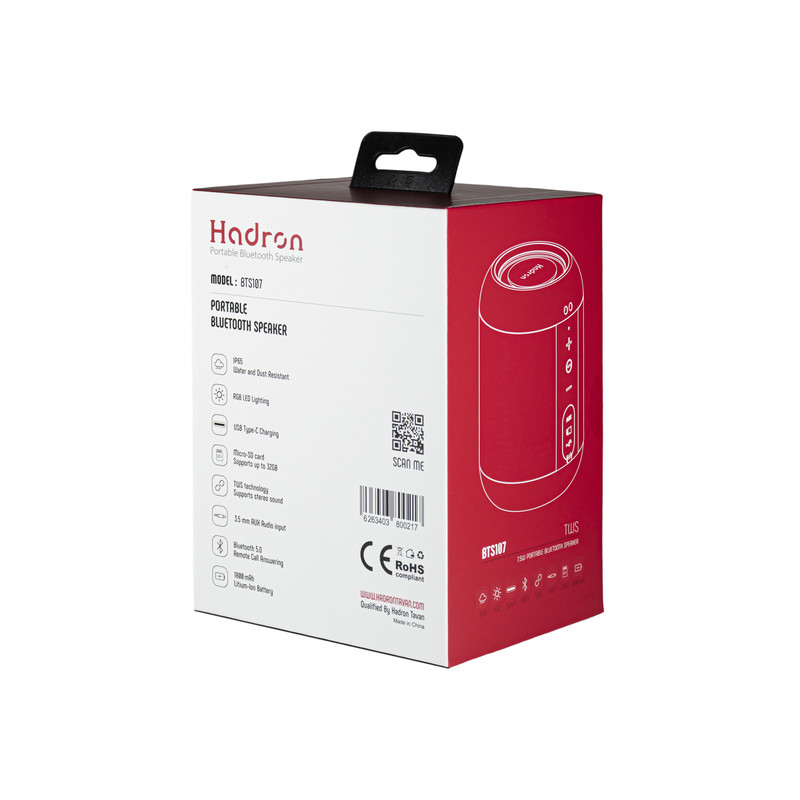 اسپیکر قابل حمل Hadron مدل BTS107 از طریق بلوتوث نسل 5 و یا کابل AUX ، به تلفن همراه هوشمند و سایر پخشکننده های صوتی دیگر متصل میشود. این محصول از قابلیت پخش استریو توسط اتصال بیسیم دو اسپیکر به یکدیگر یا تکنولوژی TWS پشتیبانی می کند. با توجه به ابعاد کوچک و وزن کم , این محصول مناسب استفاده به عنوان اسپیکر کمکی لپتاپ و سایر ادوات قابل حمل هوشمند میباشد.
