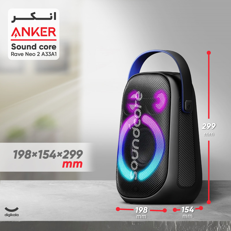 اسپیکر بلوتوث قابل حمل انکر مدل Rave Neo 2 A33A1 کیفیت صدای بالا با توان خروجی 80 وات دارد. این اسپیکر طراحی زیبا و جمعو جوری دارد. علاوه بر آن قابل حمل بوده و تنها 4.6 کیلوگرم وزن دارد. بنابراین میتواند در مهمانیهای شما مورد استفاده قرار گیرد. این اسپیکر در سفر هم شما را همراهی خواهد کرد. این اسپیکر مقاوم در برابر ضربه و آب بوده و گواهینامه IPX7 دارد. این اسپیکر از باتری به عنوان منبع انرژی استفاده میکند. باتری این اسپیکر با عمر طولانی و قابلیت شارژ سریع قابلیتهای جذابی در اختیار شما قرار میدهد. اسپیکر بلوتوث قابل حمل انکر مدل Rave Neo 2 A33A1 قابلیت اتصال به دستگاه های دیگر با بلوتوث 5.0، قابلیت پخش موسیقی با کیفیت بالا از طریق رادیو FM را هم دارد. این اسپیکر دارای نورپردازی است. درواقع این اسپیکر مجهز به رقص نور با قابلیت شخصی سازی است.
