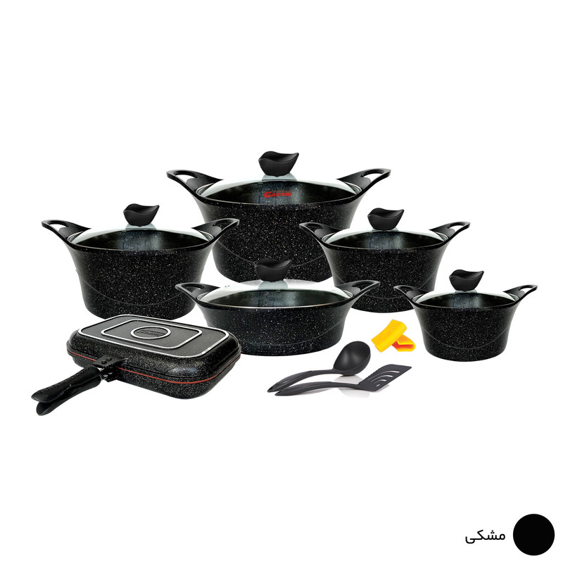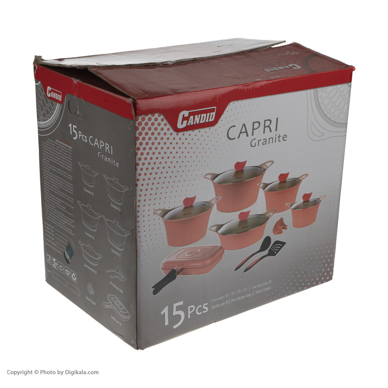 داشتن قابلمه و تابه در سایزهای مختلف یکی از کاربردیترین لوازمی است که در هر آشپزخانه به آن نیاز است. سرویس پخت و پز 15 پارچه کاندید مدل CAPRIکد 03 این ست بدنهی بسیار ضخیم و مقاومی دارد و برای طبخ انواع غذاهای ایرانی مورد استفاده قرار میگیرد. روکش تمام ظروف گرانیتی است؛ به همین دلیل از نچسببودن و شستوشوی آنها خیالتان آسوده خواهد بود. در این سرویس پختوپز توزیع حرارت در ظروف کاملا یکنواخت بوده و از ضخامت مطلوبی برخوردار است تا مانع از سوختن غذا شود. این سرویس زیبا مشتمل بر 4 قابلمه، 2 عدد تابه، 1 عدد کفگیر و 1 عدد ملاقه و 2 عدد دستگیره سلیکونی است. در صورتی که به دنبال یک سرویس پخت و پز با کاربردی فراوانی است این محصول را به شما پیشنهاد میکنیم.