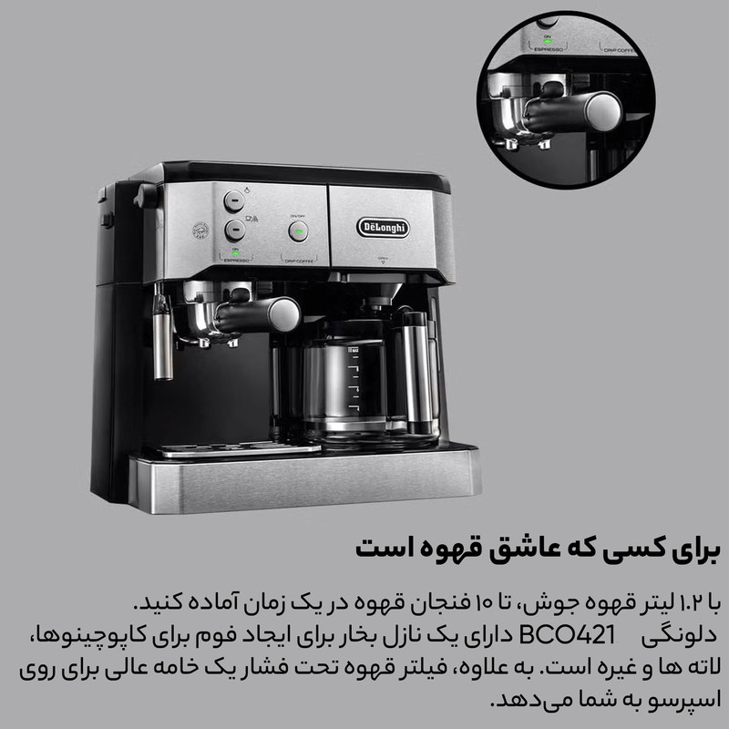 اسپرسوساز «دلونگی» (Delonghi) مدل «BCO421» دستگاهی باکیفیت است. ظاهر این دستگاه زیباست و بدنهی آن از استیل ساخته شده است. این دستگاه امکان تهیهی قهوه فرانسه، کاپوچینو و اسپرسو را دارد. برای تهیهی قهوه فرانسه یک مخزن قهوه و آب مجزا در قسمت چپ دستگاه وجود دارد. داخل مخزن قهوهی فرانسه یک فیلتر دائمی وجود دارد و بهراحتی میتوان آن را با استفاده از دستهاش خارج کرد. امکان تهیهی 10 فنجان قهوه فرانسه در این دستگاه فراهم شده است. دستگاه دارای دو نازل خروجی برای اسپرسو است و در تمپر دستگاه امکان ریختن پودر یا گذاشتن پد مخصوص وجود دارد. این دستگاه دارای صفحهی گرمنگهدار برای 10 عدد فنجان است و در قسمت زیر نازل اسپرسو، سینی چکهگیر وجود دارد؛ همچنین این دستگاه امکان تهیهی کفشیر و آبجوش نیز دارد. این دستگاه به صورت مجموع عملکرد 1750 وات توان مصرفی دارد که شامل 800 وات و 900 وات برای قسمت اسپرسو ساز و قهوه فرانسه و همچنین پرت انرژی دستگاه است. دلونگی یکی از بهترین سازندگان این دسته از محصولات است. کیفیت محصولات دلونگی همراه با خدمات پس از فروش قوی آن، تضمینشده است.