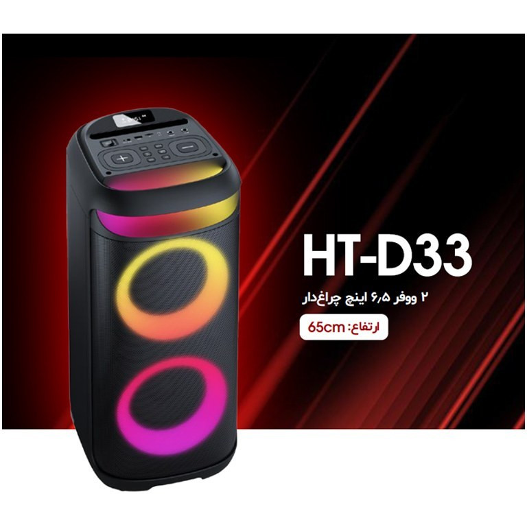 اسپیکر ایستاده شارژی رکسون مدل Rexon HT-D33، با امکانات گوناگون نظیر بلوتوث ، پورت USB، رادیو FM، ورودی میکروفن، یک میکروفن بی سیم و نورپردازی متنوع، آن را به بهترین انتخاب برای همه تبدیل میکند. این اسپیکر با توان و کیفیت صدای بالا، یکی از بهترین گزینههای بازار برای علاقمندان به موسیقی و سرگرمی می باشد.از قابلیت های مورد توجه این اسپیکر، استفاده از بلوتوث نسخه 5.0 است که امکان اتصال سریع و پایدار به دستگاههای مختلف را فراهم میکند. با داشتن پورت USB و درگاه کارت حافظه، میتوانید به راحتی از فایلهای موسیقی موجود در حافظه داخلی یا دستگاههای خارجی استفاده کنید. وجود رادیو FM در این اسپیکر، امکان گوش دادن به محتوای مورد علاقه در هر زمان و مکان را فراهم میکند.این اسپیکر دارای دو ورودی میکروفن می باشد. همچنین با داشتن میکروفن بی سیم و ریموت کنترل، این اسپیکر امکان کنترل و استفاده آسان را برای شما فراهم میکند. یکی از ویژگیهای جالب این اسپیکر، پنل دیجیتالی و نورپردازی و تولید جلوه های جذاب با افکت های متنوع است که محیطی جذاب و دلنشین را برای شنوندگان ایجاد میکند.با توان خروجی 400 وات، این اسپیکر قادر است صدای قوی و بینظیری را تولید کند.