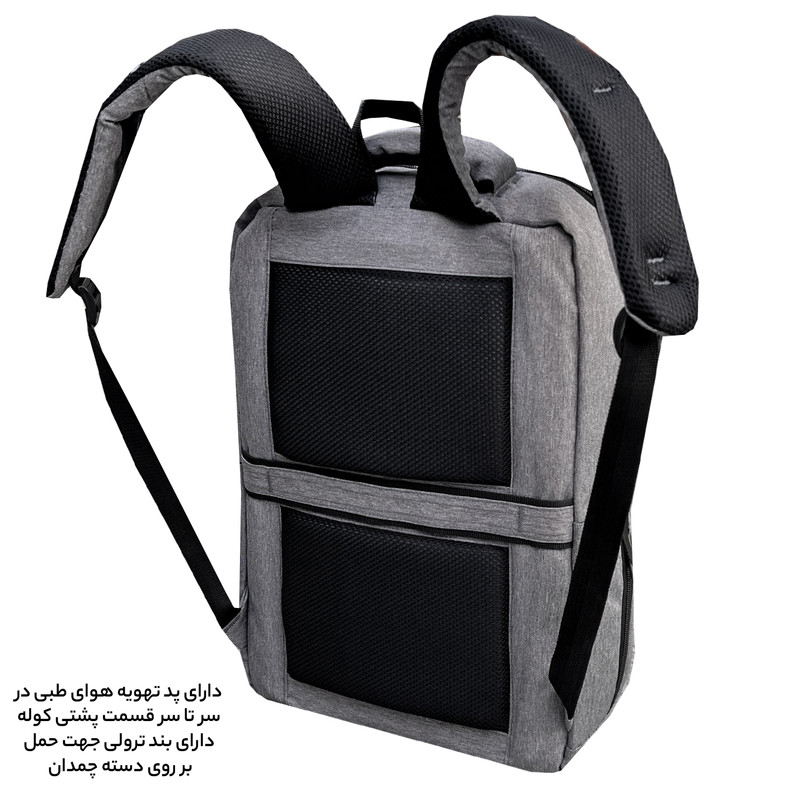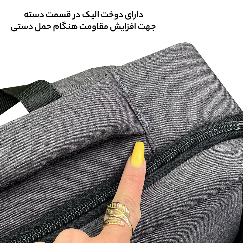 دارای دو بند کولی همراه با پد تهویه هوا جهت حمل به صورت کوله دارای یک دسته از جنس نوار همراه با دوخت الیک جهت حمل به صورت دستی دارای یک دسته از جنس نوار الگانس جهت حمل دستی و آویزان کردن کوله