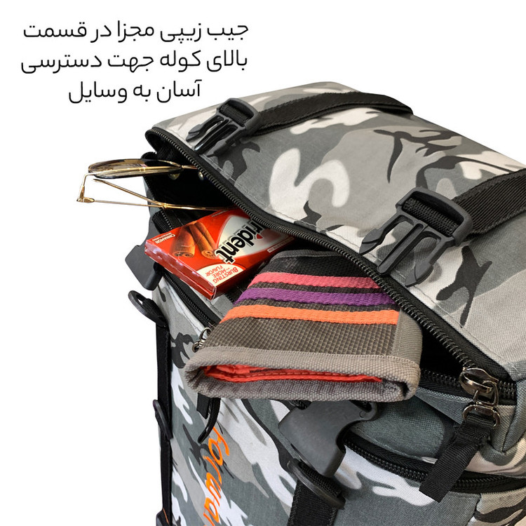- دارای یک جیب زیپی مجزا در قسمت بالای کوله - دارای یک جیب زیپی در قسمت جلوی کوله - دارای دو جیب زیپی بزرگ در دو طرف کوله جهت قرار دادن وسایل و یا بطری نوشیدنی تا 1.5 لیتری