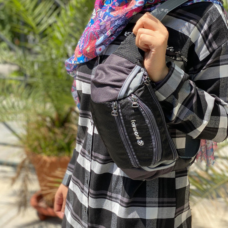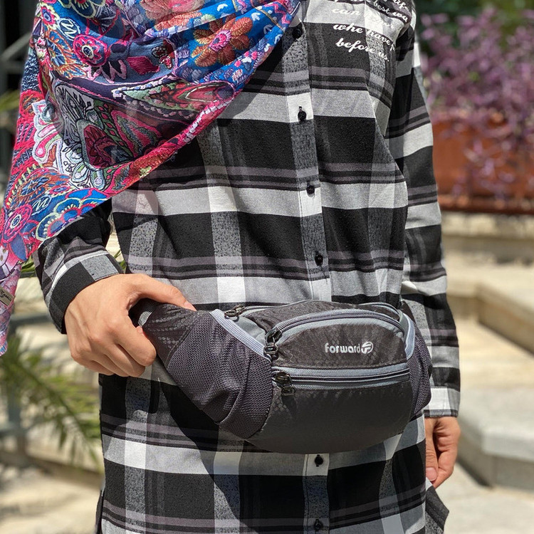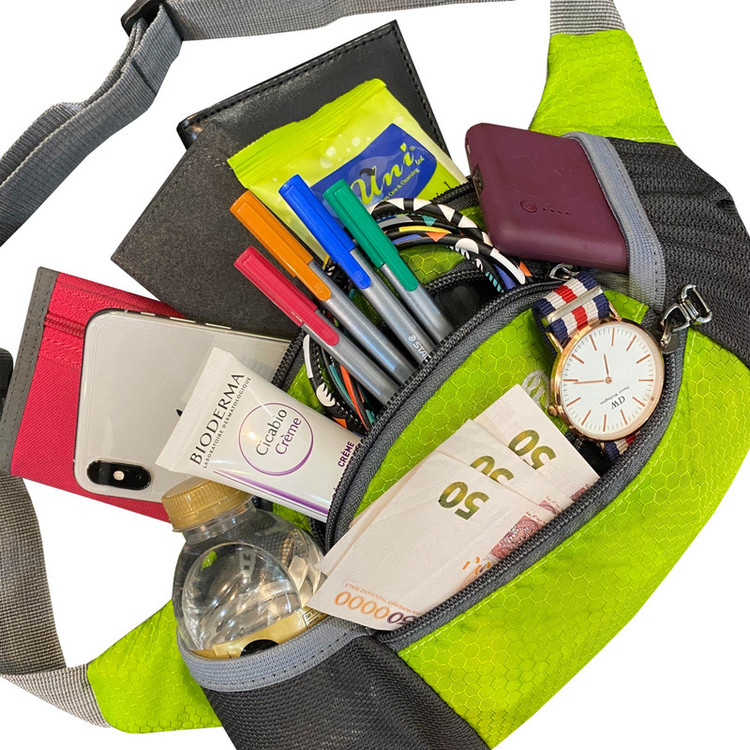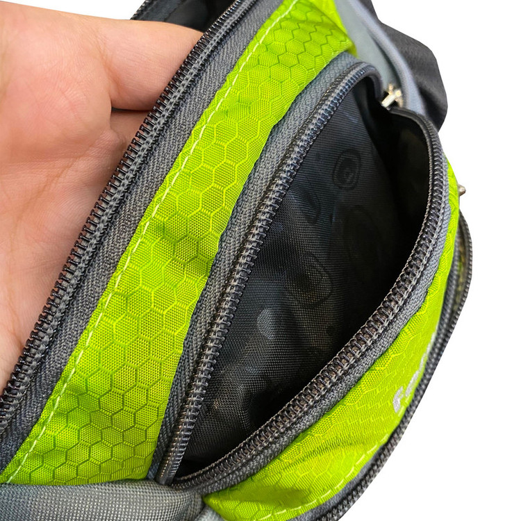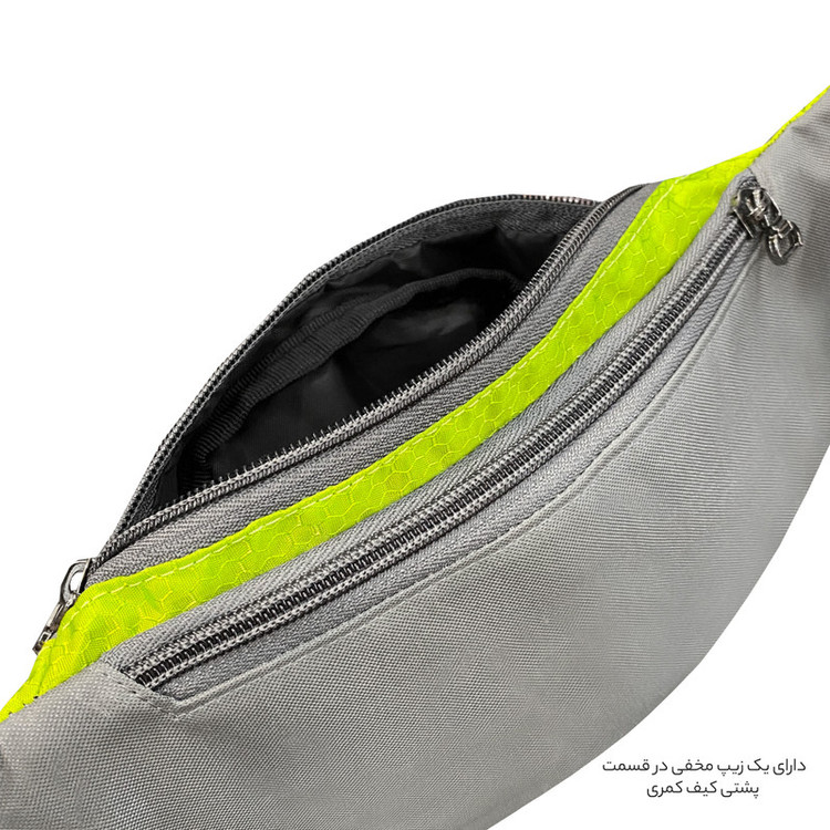 دارای یک زیپ مخفی در قسمت پشتی کیف کمری دارای 3 زیپ بزرگ در قسمت جلویی کیف کمری دارای دو جیب توری کش دار جهت قرار دادن وسایل و بطری نوشیدنی