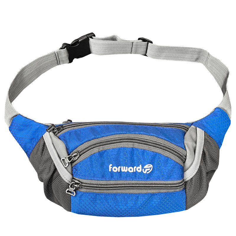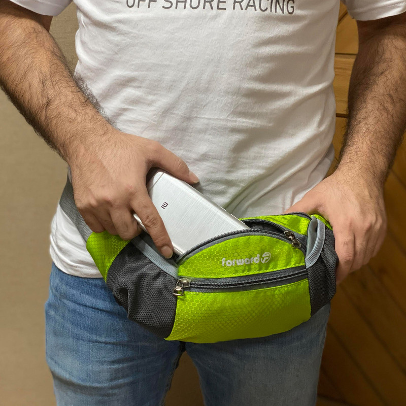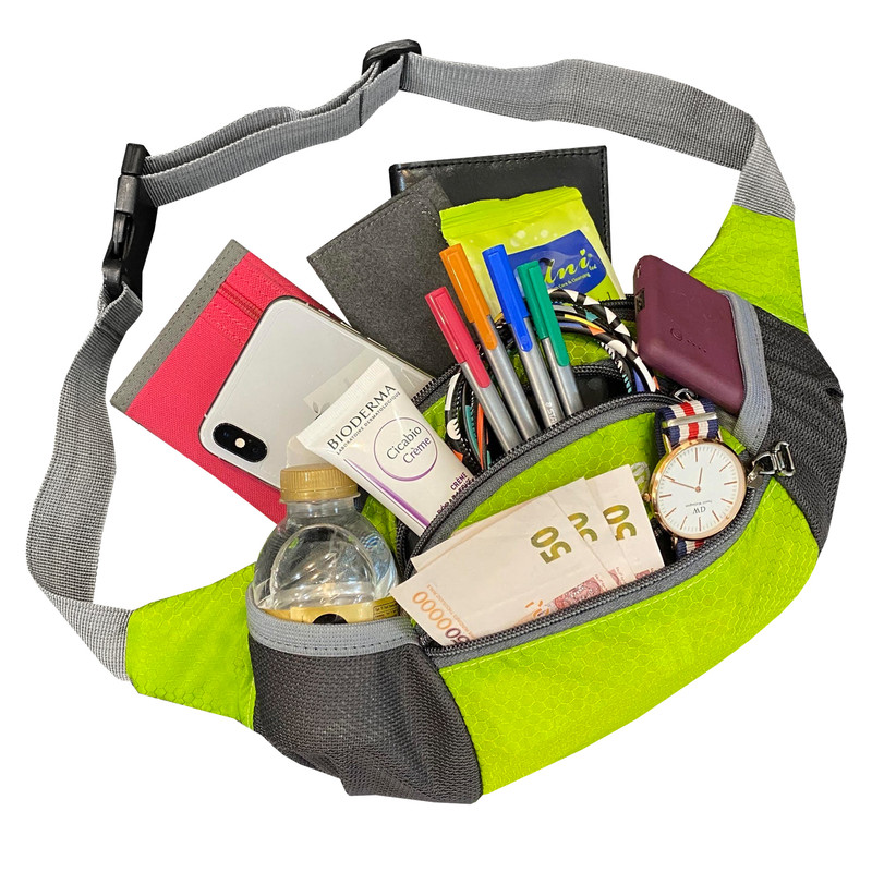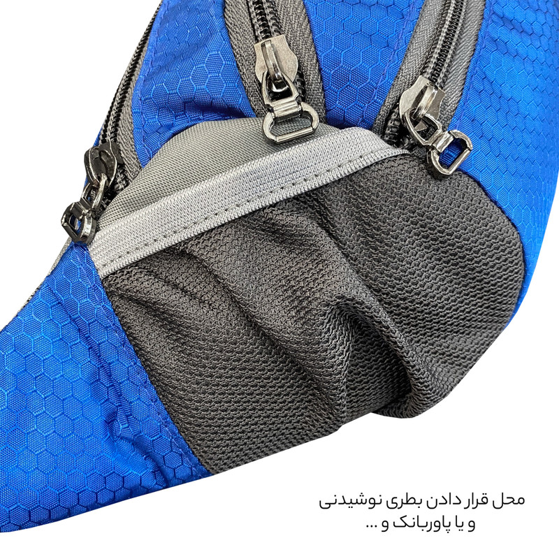 دارای یک زیپ مخفی در قسمت پشتی کیف کمری دارای 3 زیپ بزرگ در قسمت جلویی کیف کمری دارای دو جیب توری کش دار جهت قرار دادن وسایل و بطری نوشیدنی