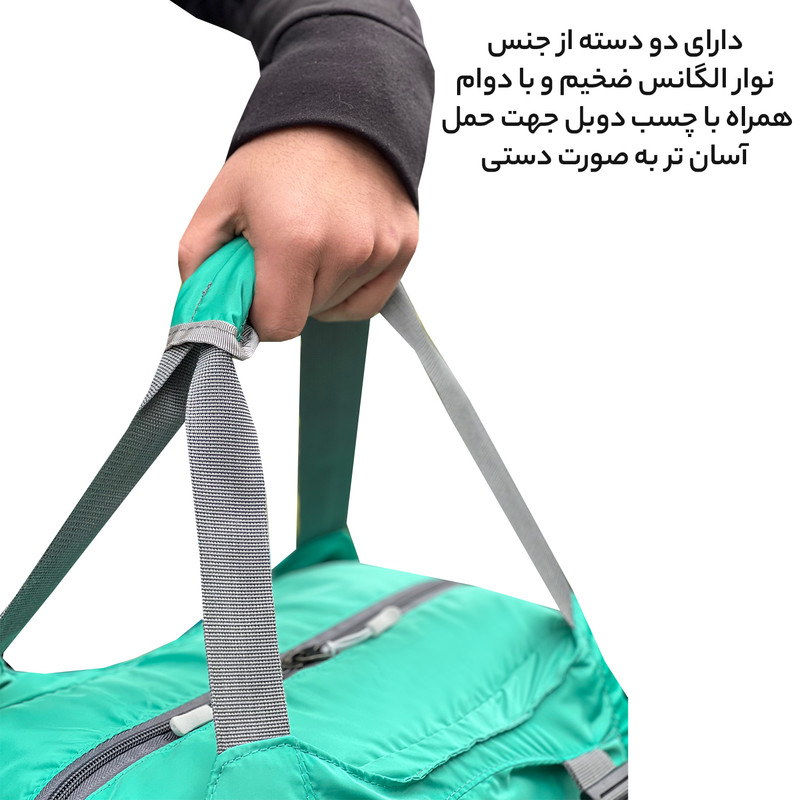 دارای دو دسته از جنس نوار الگانس ضخیم همراه با پوشش چسبی دوبل جهت حمل آسان تر به صورت دستی دارای یک بند بلند قابل جدا شدن و قابل تنظیم جهت حمل به صورت دوشی
