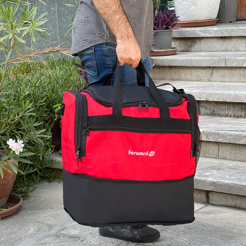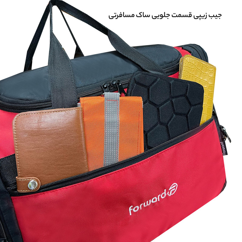 دارای یک بند بلند قابل تنظیم و قابل جدا شدن جهت حمل به صورت دوشی دارای ابر و آستر داخلی در تمامی قسمت های ساک دارای 5 عدد پایه استوک در قسمت کف ساک سفری جهت افزایش ایستایی و مقاومت ساک دارای جنس بدنه ضد آب و قابل شست و شو