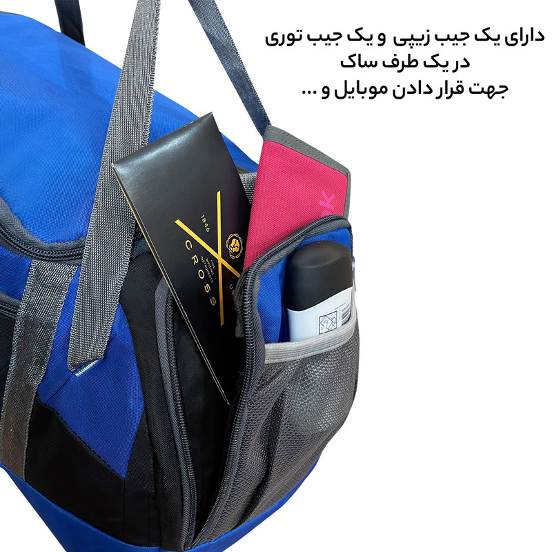 دارای پایه استوک در قسمت زیرین ساک دارای جنس بدنه برزنت ضد آب و قابل شست و شو دارای ابر و آستر در سرتا سر قسمت داخلی ساک