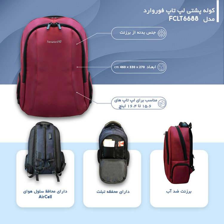 مناسب برای لپ تاپ های سایز 15.6 تا 16.4 اینچ جنس: برزنت ضد آب دارای محفظه تبلت دارای جک هندزفری دارای محافظ سلول هوای AirCell