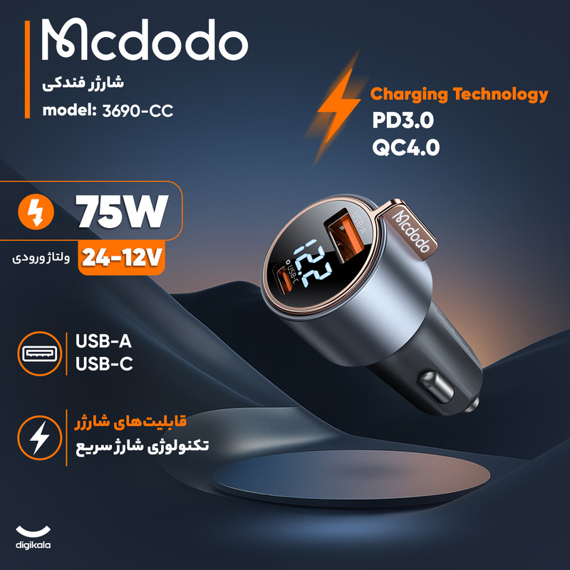 شارژر فندکى 75وات مک دودو مدل CC-3690 ساخته شده از آلیاژ آلومینیم و مواد PC+ABS علاوه بر ظاهر شکیل دارای استحکام مناسبی میباشد.این فندکی دارای دو خروجی USB و تایپ سی با توان خروجی مجموع 75 وات است که سهم تایپ سی 45 وات و USB توان 30 وات را پشتیبانی میکند.این فندکی از پروتکل های شارژ سریع PD3.0/ PPS/ QC4+/ QC3.0/ AFC/ FCP/ SCP/ SFC2.0/ BC1.2/Samsung/Apple 2.4A انواع موبایل و تبلت (بسته به قابلیت دستگاه و کابل مورد استفاده) پشتیبانی می نماید.این شارژر فندکی دارای نمایشگر ولتاژ میباشد که سهولت کار در تاریکی خودرو را نیز فراهم میکند.از شارژر فندکى 75وات مک دودو در انواع خودرو سواری و کامیون و اتوبوس می توان استفاده نمود.ساپورت ولتاژ ورودی DC 12V-24V از ویژگی های این فندکی است.