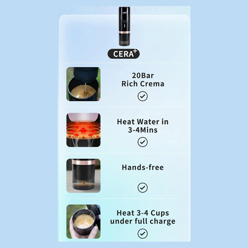 دستگاه های اسپرسو ساز انواع مختلفی دارند که هر کدام ویژگی منحصر به فرد خود را دارد. در این میان دستگاه های قابل حمل برای علاقه مندان به قهوه، افرادی که به سفر و کمپینگ علاقه ی زیادی دارند و ورزشکارانی که بعد از ورزش نیاز به کافئین دارند، محبوبیت بیشتری دارد. اسپرسو ساز سفری سرا پلاس مدل PCM03 از جنس پلاستیک ABS و آلیاژ آلومینیوم ساخته شده است که آن را بسیار سبک و در عین حال مقاوم میسازد. با وزنی کمتر از یک کیلوگرم (640 گرم) و ابعاد کوچک (226×69 میلیمتر) به راحتی قابل حمل و جابجایی است و با توجه به باتری 7500 میلی آمپری، به طور کامل نیاز شما را مرتفع می سازد.