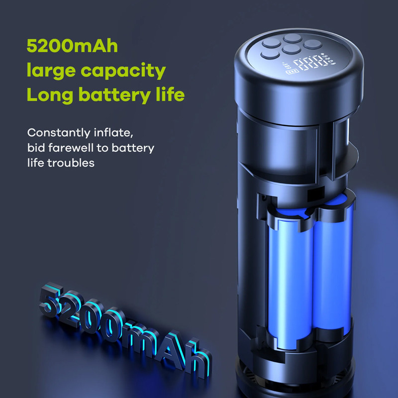 ظرفیت باتری: 5200 میلی آمپر ساعت | دارای پورت Type-C و پورت پمپ باد | فشار تولیدی پمپ باد تا 150PSI | دارای چراغ قوه | نمایشگر دیجیتالی