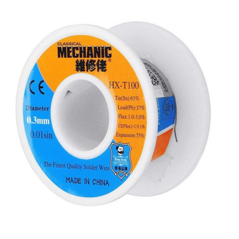 سیم لحیم HX-T100 0.3 از شرکت مکانیک می باشد. این سیم لحیم دارای 0.3 میلی متر قطر و وزن 50 گرم است که به دلیل نازل بودن این سیم برای کارهای بردهای موبایل و انواع بردهای الکترونیکی با دقت بالا و ظریف کاری مناسب است . همچین درصد قلع به سرب در این سیم لحیم 63/37 است که کیفیت بسیار بالایی نیز دارد و دارای فلاکس برای بهتر شدن عملکرد آن است.